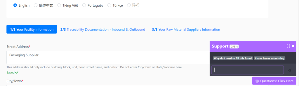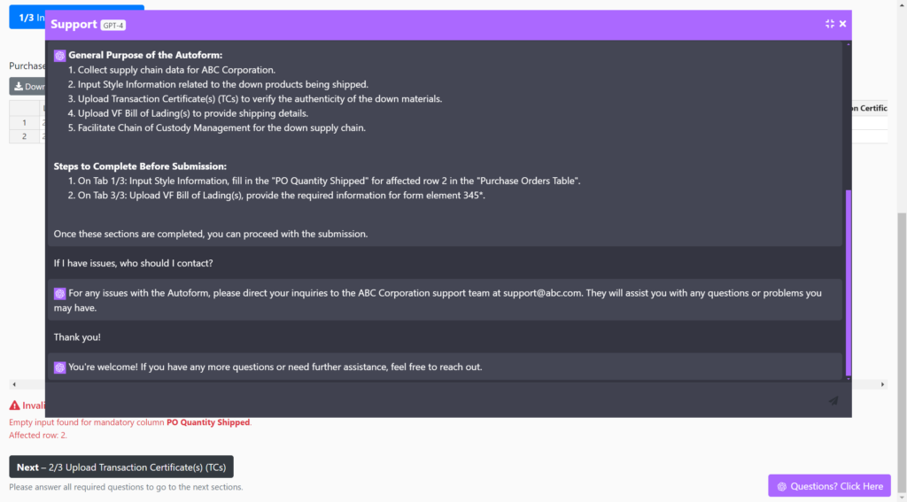 In our commitment to continuous improvement, we are excited to announce the February 2024 update to our Autoform application: the integration of a chat box powered by Chat-GPT model 4. This intelligent chat assistant is tailored specifically to assist suppliers in navigating the form-filling process with ease and precision.